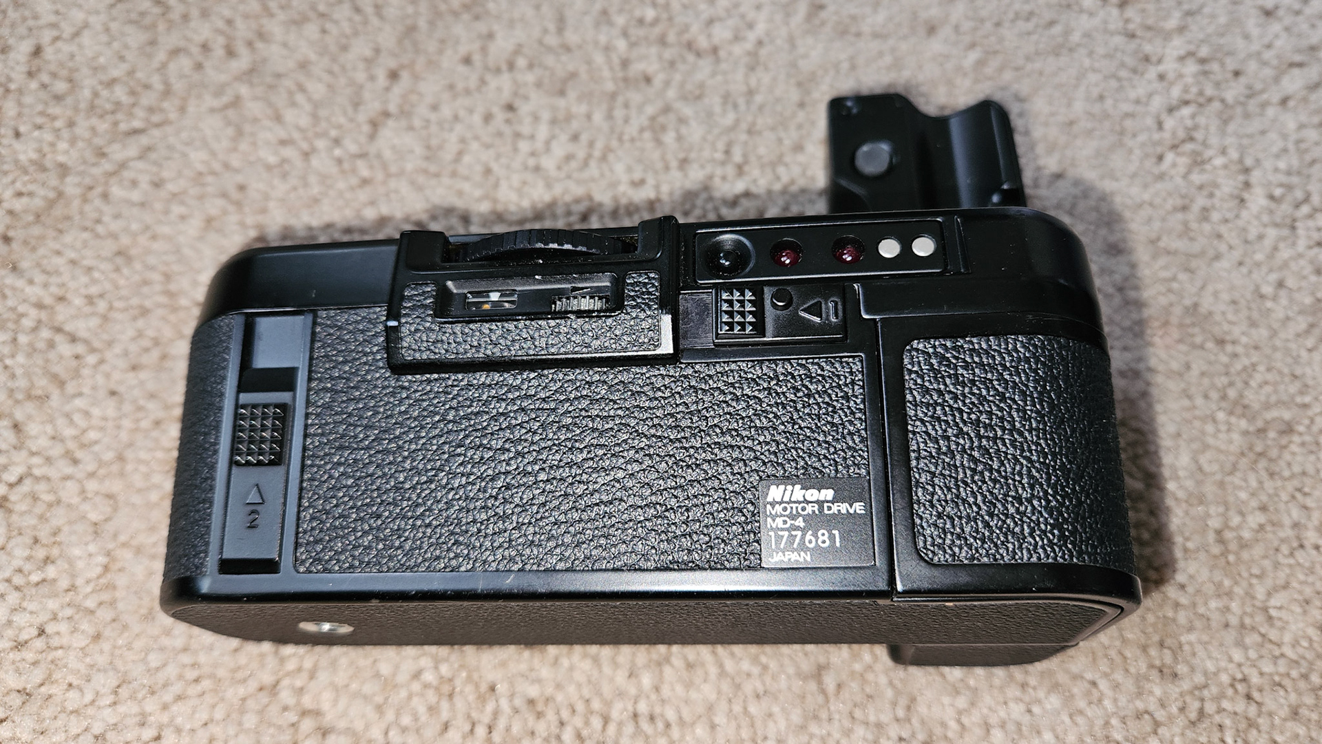 The Nikon MD‑4 is the dedicated motor drive for the Nikon F3 series, providing high‑speed motorized film advance, automatic rewind, and power to the camera body. It can reach up to 6 frames per second with the optional NiCd pack and supports single or continuous shooting modes.