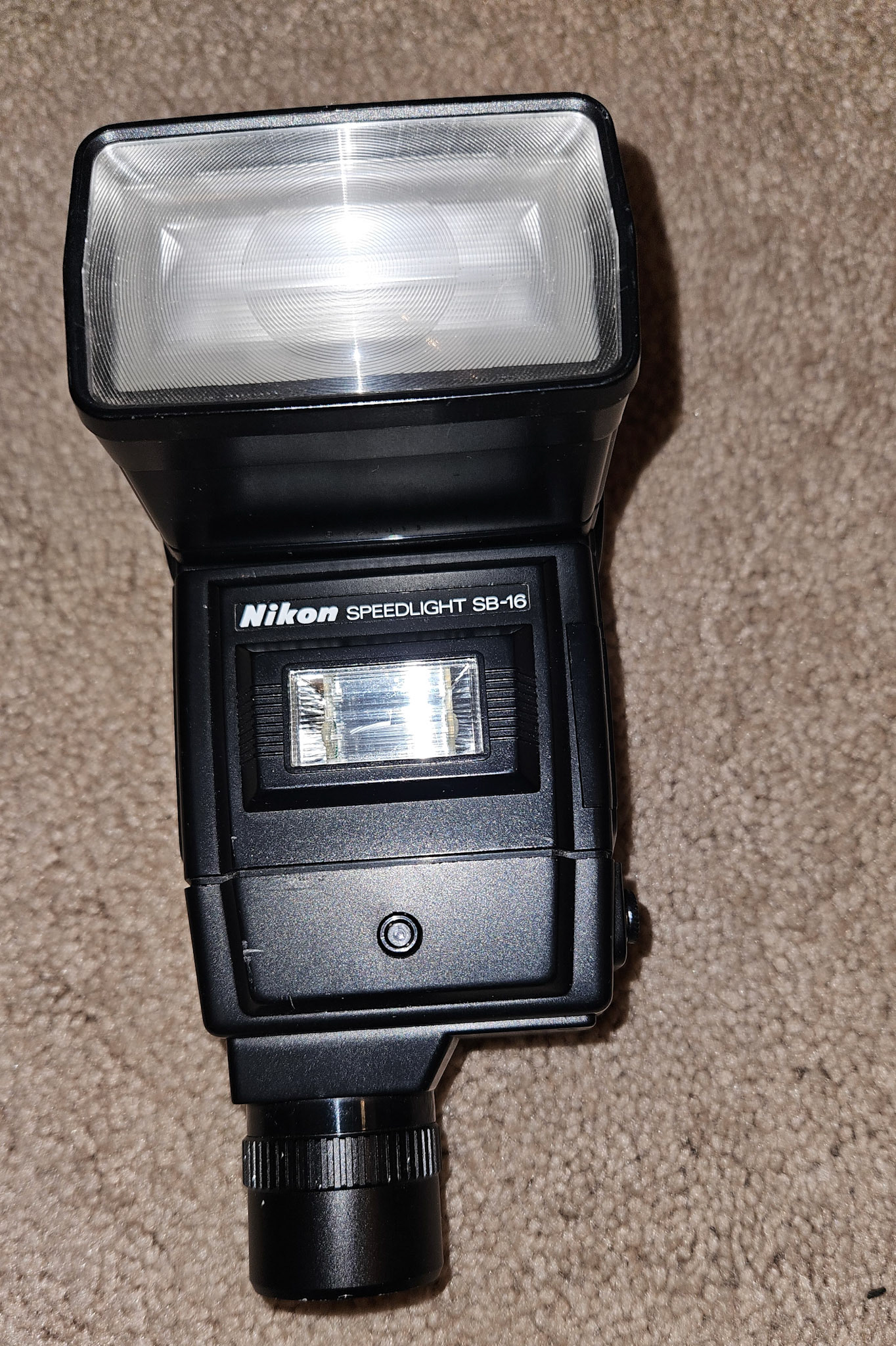 The Nikon SB-16 is a modular TTL/auto/manual Speedlight for Nikon film SLRs, notable for its dual flash heads and interchangeable foot for either the F3 or standard ISO hot shoe.