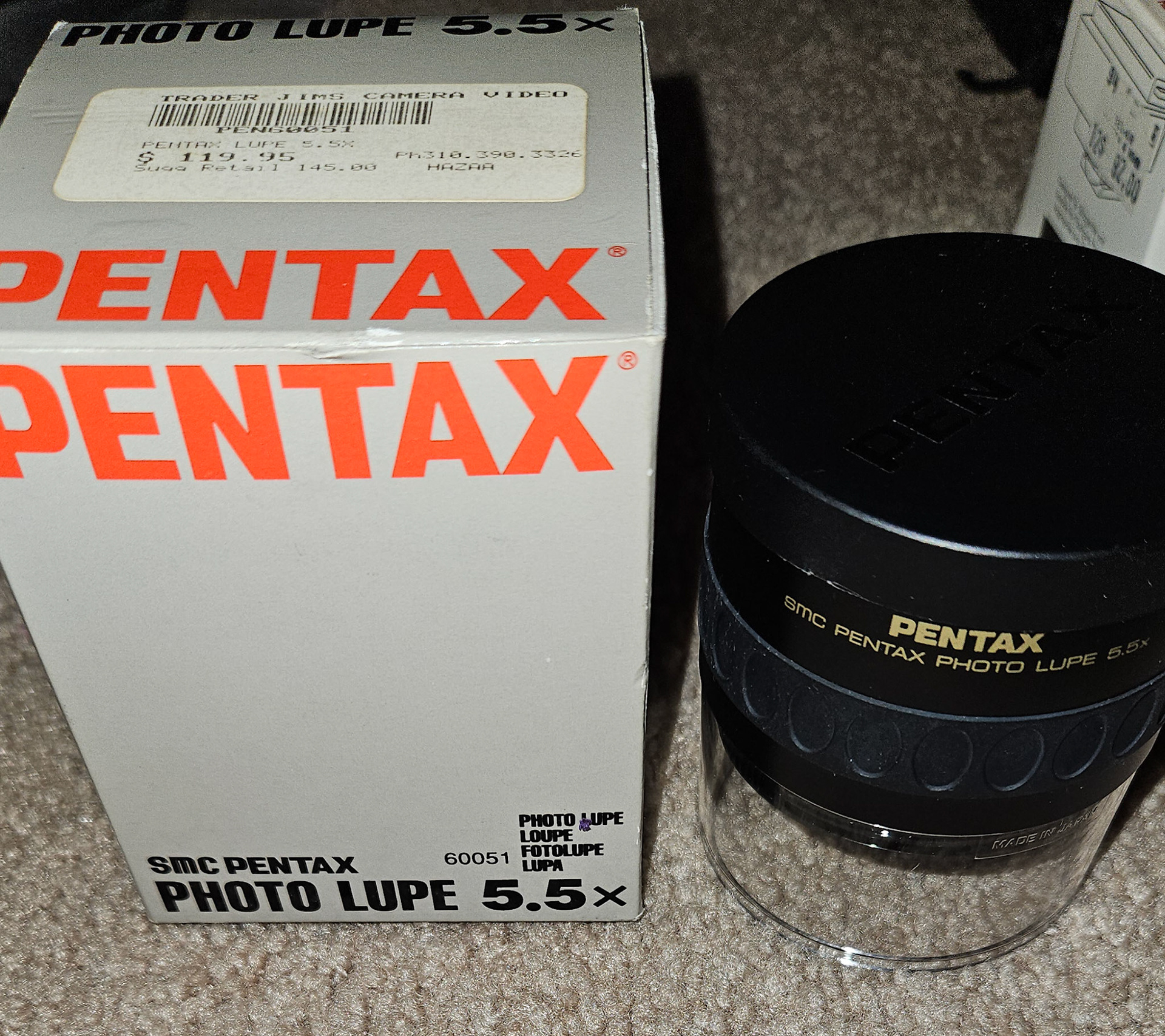 The SMC Pentax Photo Lupe 5.5x is a high‑quality slide/negative viewing loupe designed for critical inspection of 35 mm and medium‑format film, using Super‑Multi‑Coated optics and 5.5× magnification.
