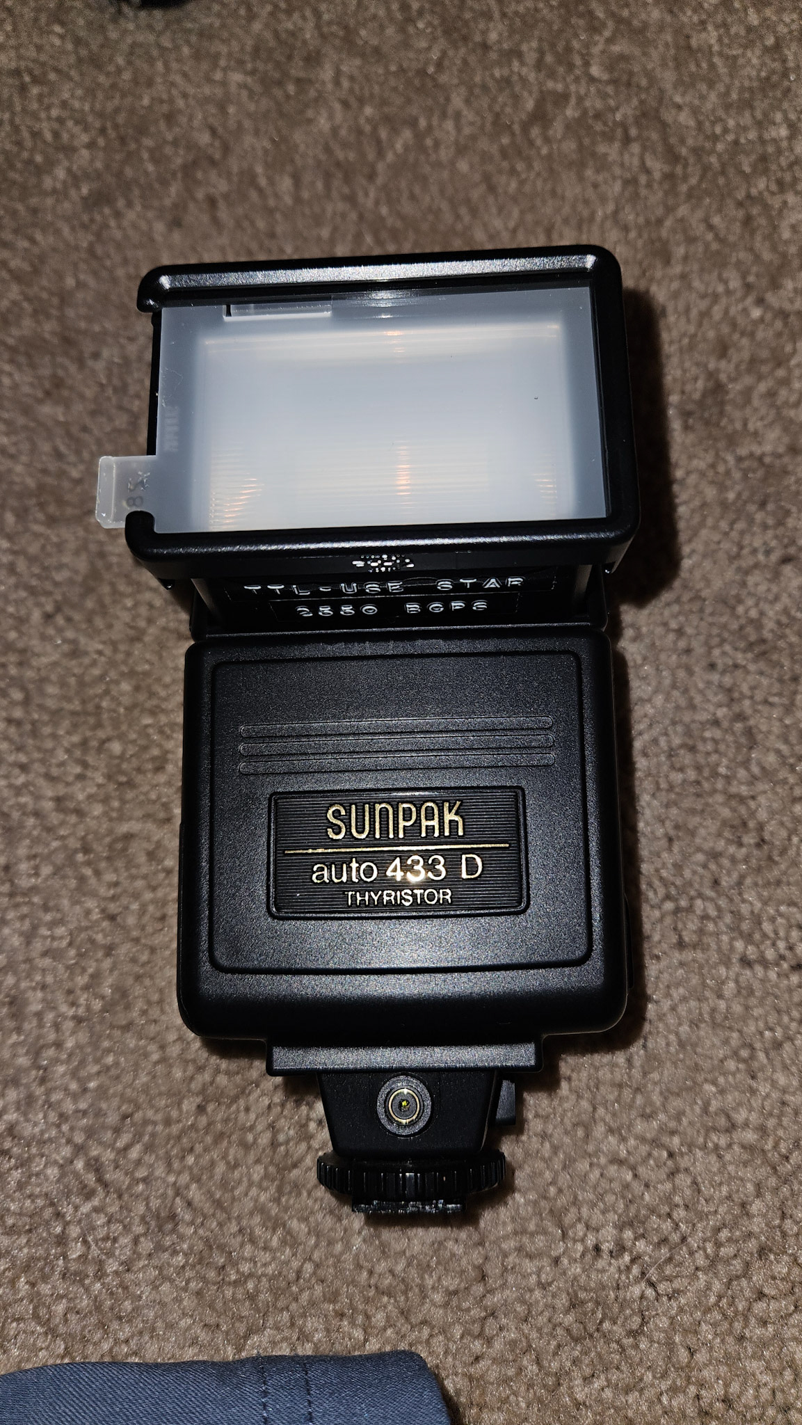 The Sunpak Auto 433D is a hot‑shoe, thyristor‑type auto flash with bounce/swivel head, multiple auto‑aperture modes, and a relatively powerful guide number in a compact package (I need to confirm if for Nikon or Cannon)