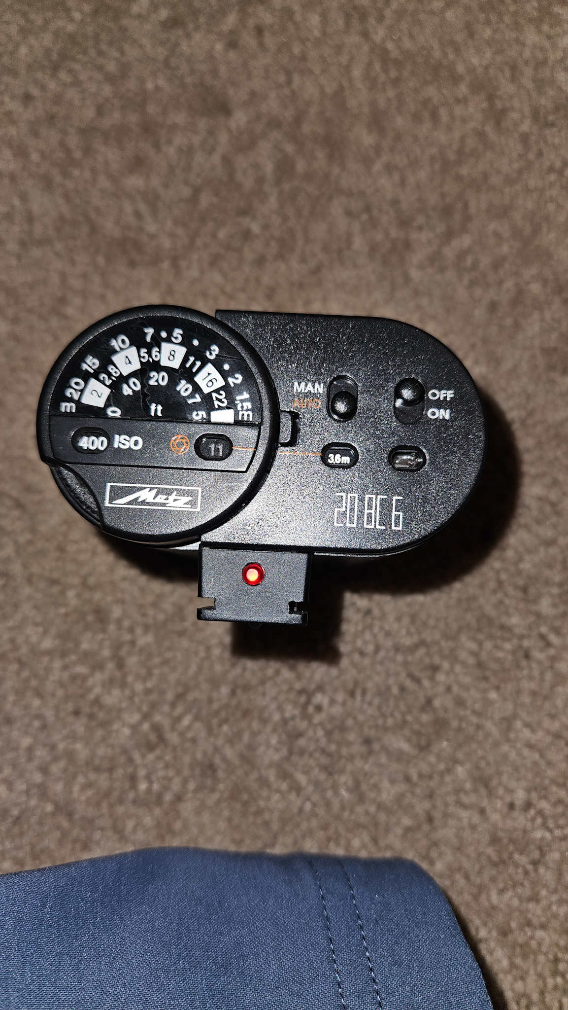The Metz mecablitz 20 BC 6 is a compact, shoe‑mount manual/auto flash with a modest guide number of about 20 at ISO 100 and 35 mm coverage, designed mainly as an inexpensive fill‑flash for non‑AF film cameras. It runs on AA batteries and is well‑suited to close‑range portraits, snapshots, and small indoor spaces.