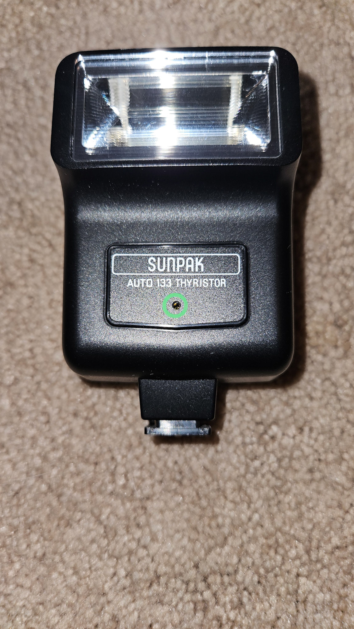 The Sunpak Auto 133 is a small, hot‑shoe auto‑thyristor flash with both automatic and manual modes, aimed at simple on‑camera use on 35 mm film cameras.